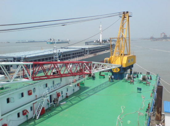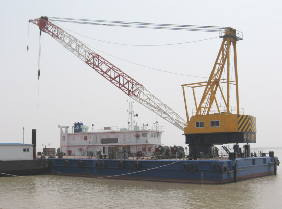 由中交二公局集團(tuán)承建,采用中昇建機(jī)ZSF2700(271000)船式起重機(jī)(柴油驅(qū)動(dòng)中國船級(jí)社CCS認(rèn)證),最大吊重27m處吊100t,已于2008年二月于江蘇省江都港口舉行下水儀式且已正式啟用,此一船吊為我公司又一成功之大起重量起重設(shè)備。