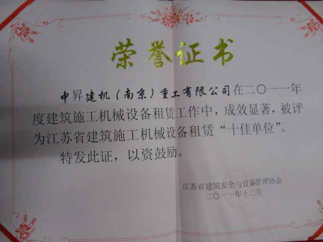 中昇建機(jī)被評(píng)為2011年度江蘇省建筑施工機(jī)械設(shè)備租賃“十佳單位”