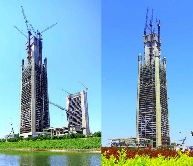 由中建三局承建的天津高銀117大廈工程采用了中昇建機ZSL2700(2臺)、ZSL1250(2臺)共4臺塔機,吊裝順利進行!ZSL2700在世界高層鋼結(jié)構(gòu)建設(shè)中,屬超大型的內(nèi)爬式動臂塔式起重機。ZSL2700采用柴油發(fā)動機引擎驅(qū)動,該塔機最大工作幅度為65m,而在27m吊裝幅度范圍內(nèi)可吊重達100t,最大起升高度達597m,起升速度達110m/min。其吊裝性能和技術(shù)水平在國內(nèi)處于領(lǐng)先地位!