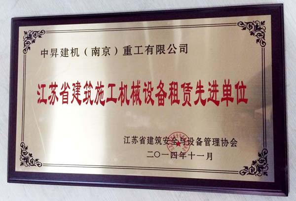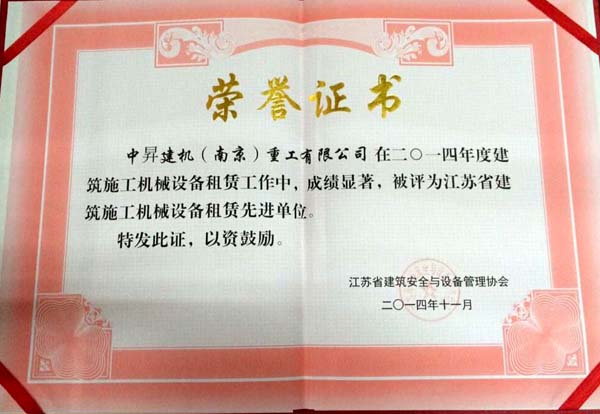 2014年11月中昇建機(jī)(南京)重工有限公司因優(yōu)秀的設(shè)備管理水平被江蘇省建筑安全與設(shè)備管理協(xié)會(huì)評(píng)為“江蘇省建筑施工機(jī)械設(shè)備租賃先進(jìn)單位”榮譽(yù)稱號(hào),并頒發(fā)了證書和獎(jiǎng)?wù)隆?