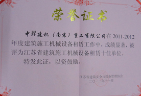 中昇建機(jī)被評(píng)為2011~2012年度江蘇省建筑施工機(jī)械設(shè)備租賃“十佳單位”