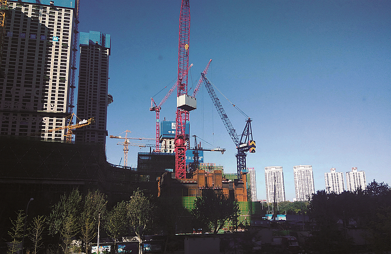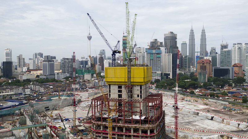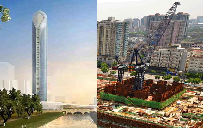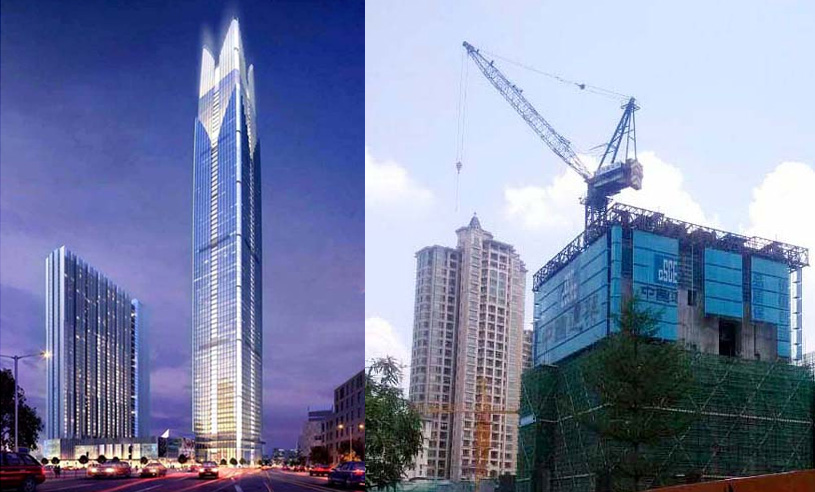 建筑主體高度438米,采用中昇建機(jī)ZSL1250(64T)及ZSL380(32T)各一臺(tái)。
