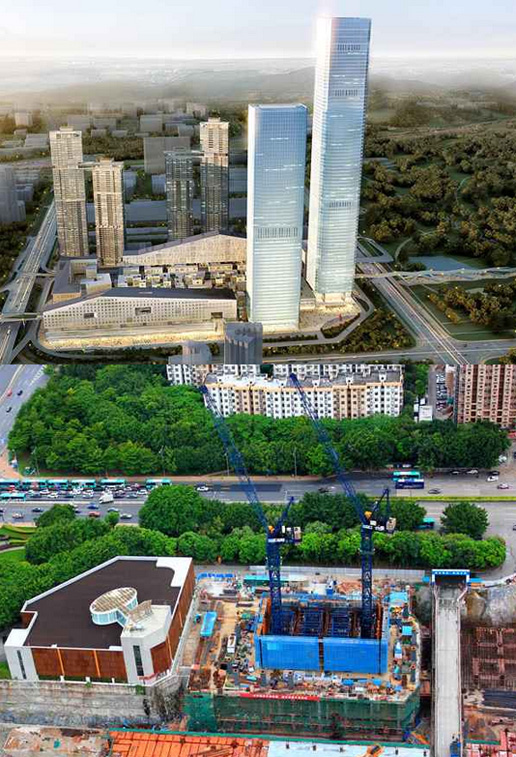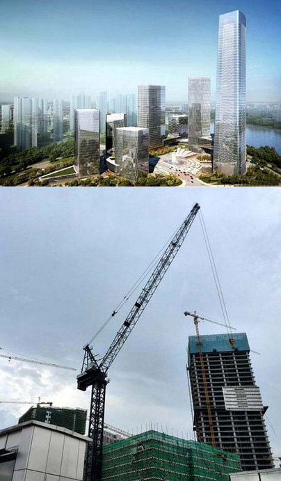 施工高度428米,采用中昇建機(jī)ZSL850(50t)、ZSL750(50t)、和ZSL380(32t)各一臺(tái)。